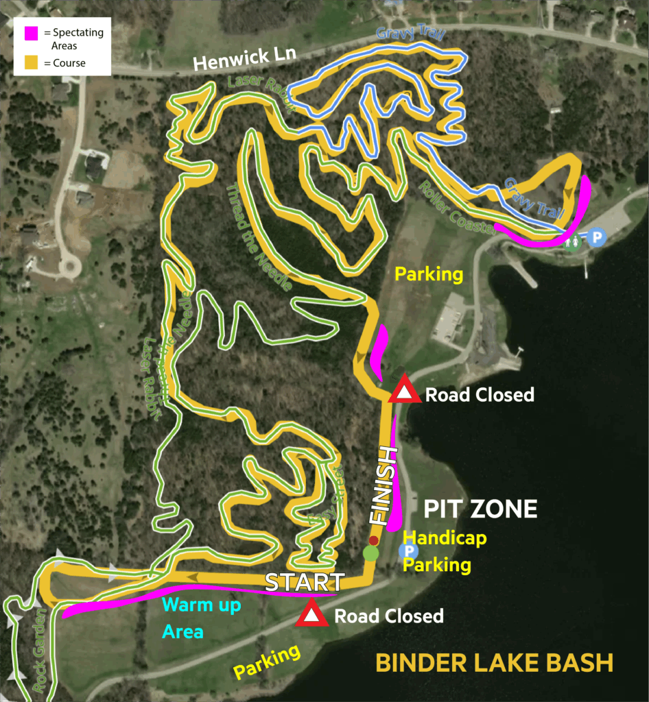 IMPORTANT: Binder Lake Road will be CLOSED through the Pit Zone area (see maps) on Saturday 8/24 from 1:00 PM – 5:00 PM and on Sunday from 7:00 AM – 5:00 PM.